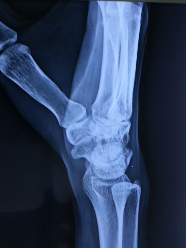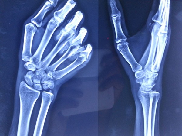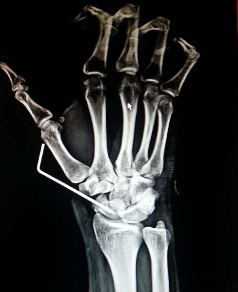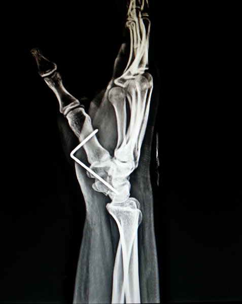 The young, male patient had the fracture of Rt scaphoid/ due to falling on an outstretched hand. The scaphoid fracture was treated, with the plaster cast for 1 ½ month elsewhere. Fracture of Rt Scaphoid was not united. This condition is called, the scaphoid non-union. It was treated with open reduction, and the iliac crest, bone grafting, and K wire stabilization.